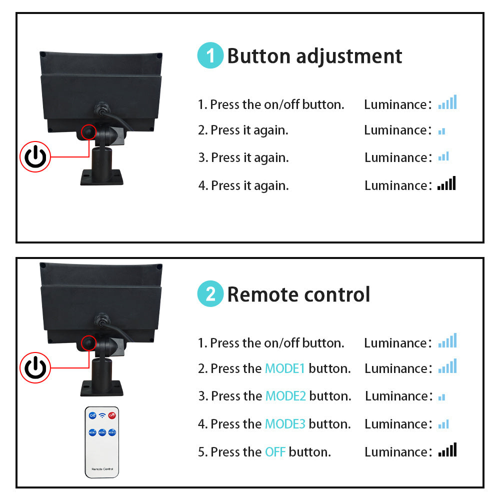 With the included remote control, adjusting the settings of our solar light is a breeze. Easily switch between the different lighting modes, adjust the brightness, and control the motion sensor function from the comfort of your home. No more climbing ladders or struggling with hard-to-reach switches - our remote control makes using this solar light a breeze.
