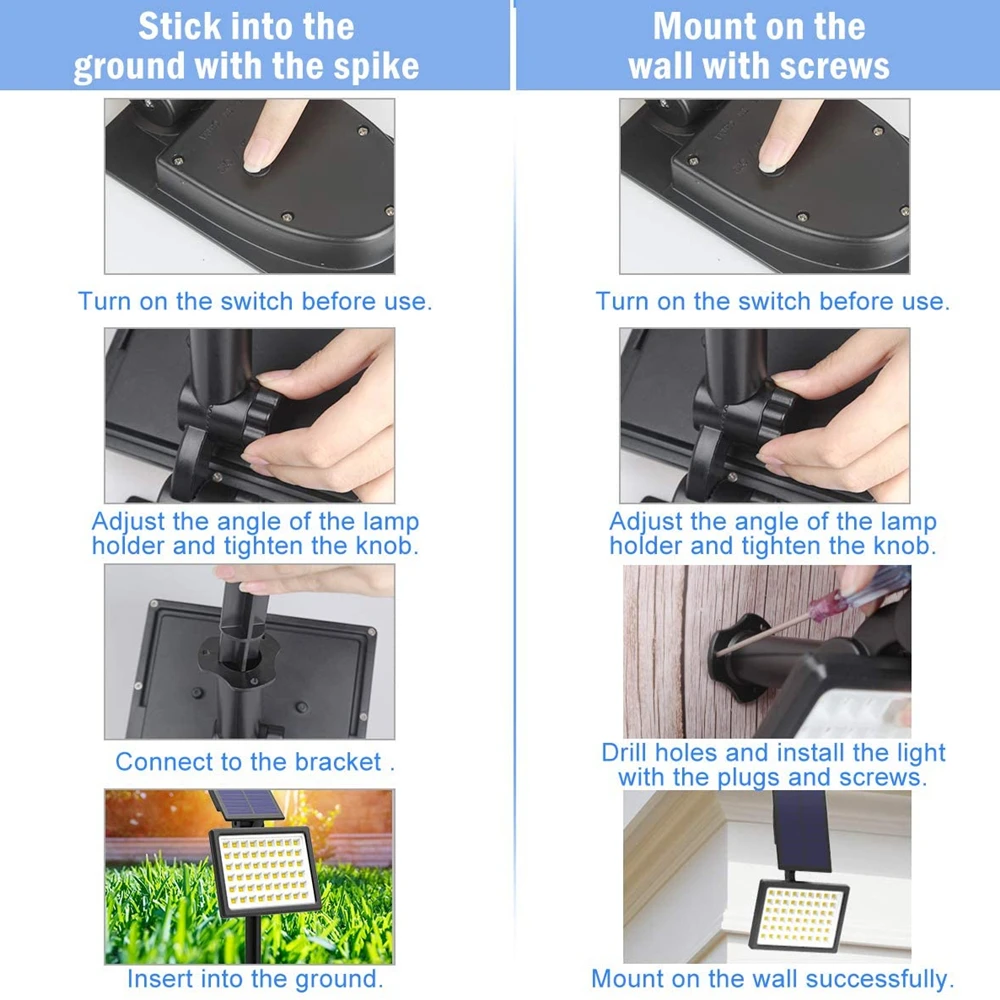 Looking to enhance your outdoor space with a reliable and modern solar light? Our 1piece/2pieces 50/54LED Adjustable Solar Light is the perfect solution! Designed to withstand any weather condition, this solar spotlight has an IP65 protection level, making it completely waterproof. Illuminate your garden or outdoor area with ease!