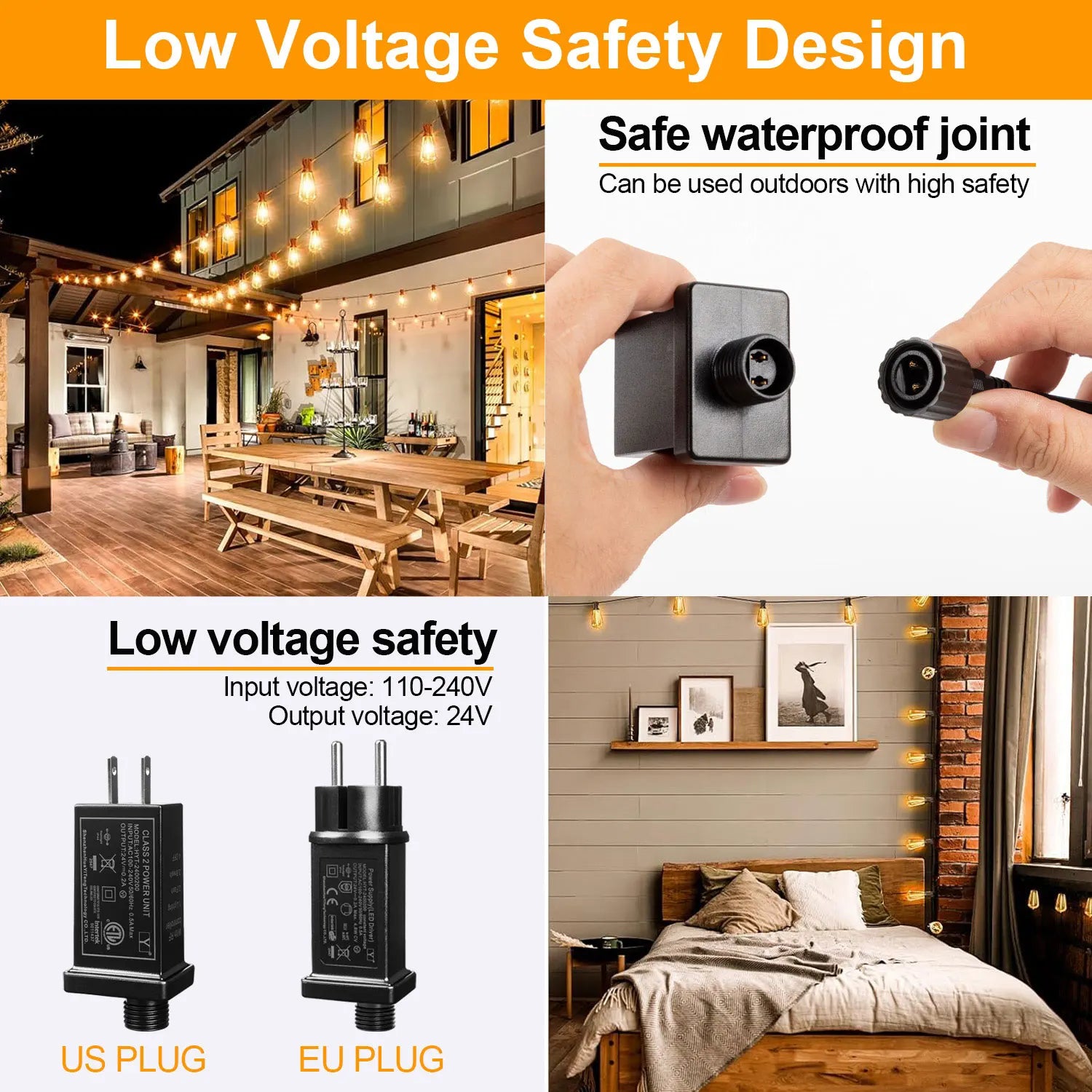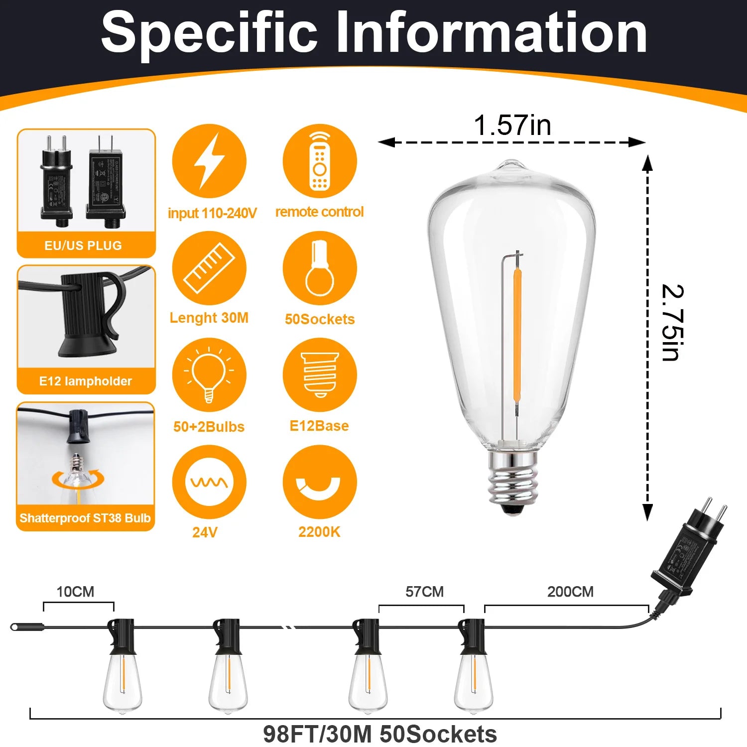 ST38 Outdoor String Lights with Remote: Bring timeless elegance to your outdoor spaces with ST38 low-voltage outdoor string lights. Featuring energy-efficient ST38 vintage Edison bulbs and E12 base, this set delivers a warm 2700K glow at just 1W per bulb. The 24V plug-in design ensures stable operation making it ideal for permanent installations.