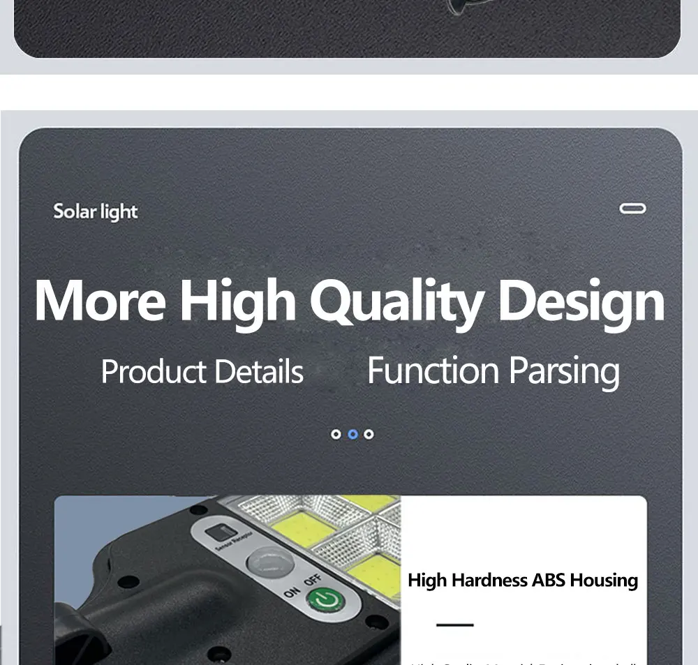 Introducing the LED Solar Street Light Outdoor Exterior Waterproof with 3 Light Mode PIR Motion Sensor High Bright Solar Lamp for Garden Patio! This modern solar light is perfect for your holiday home needs. It features a powerful lithium battery and an IP66 protection level, ensuring that it can withstand all weather conditions. The ABC Solar Light is powered by solar energy, making it an eco-friendly and cost-effective lighting solution for your outdoor space.