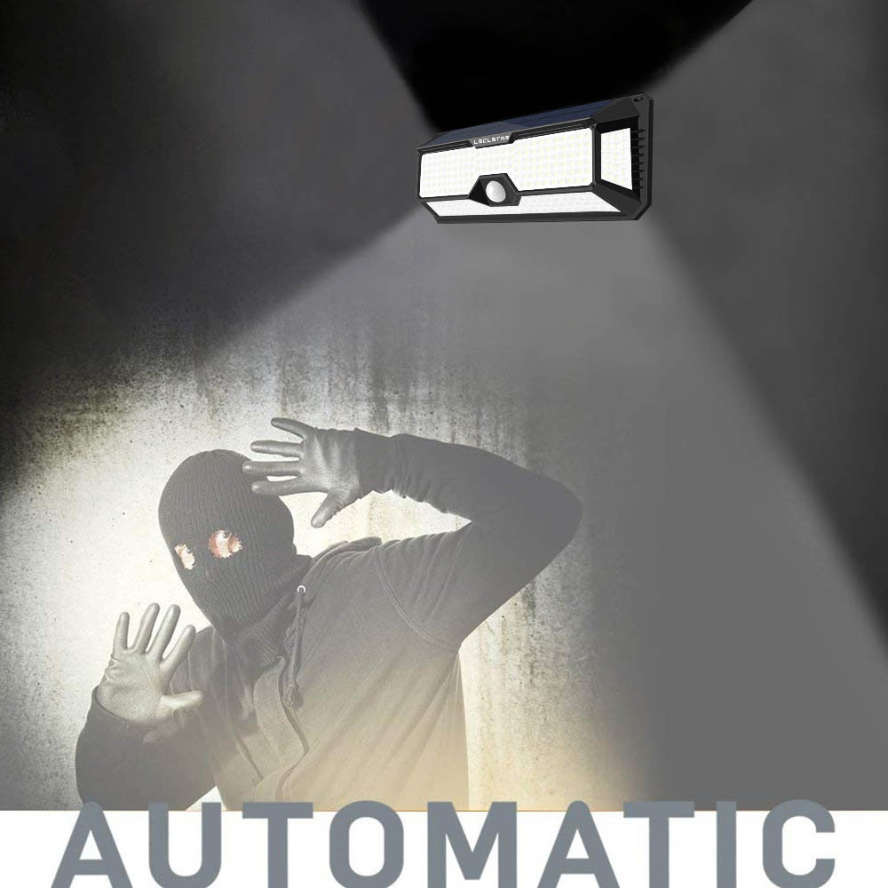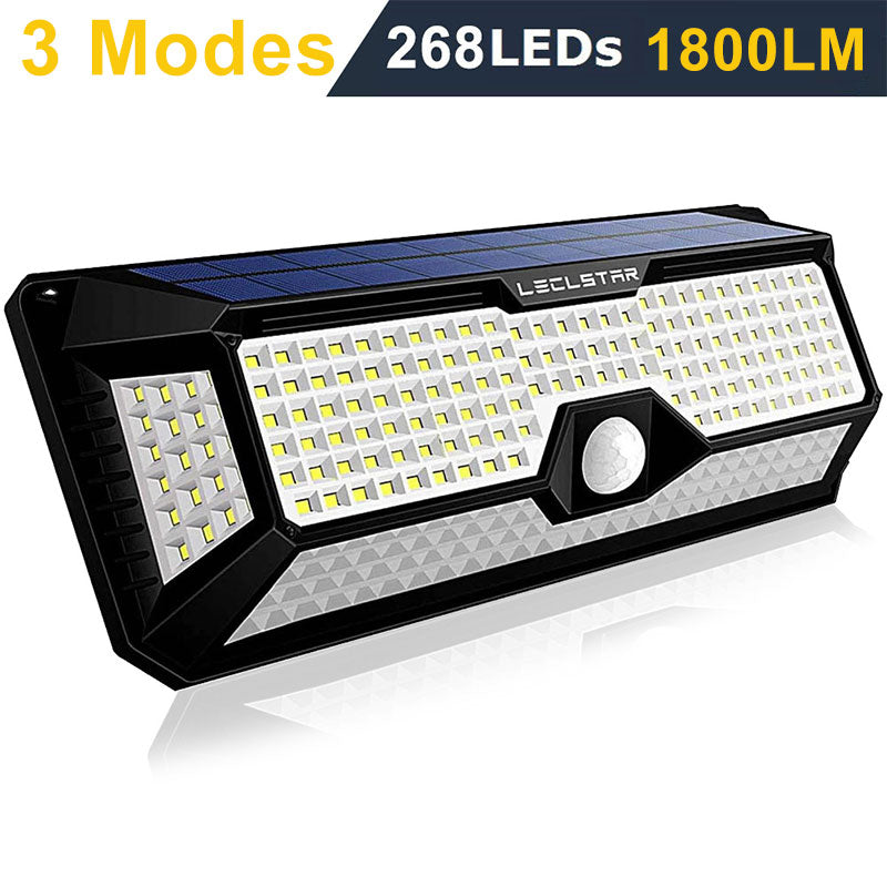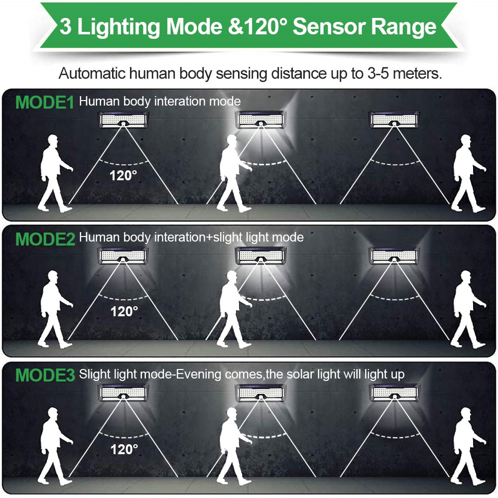 Solar motion sensor light outdoor has 3 various intelligent lighting modes with wide lighting angle of 270° to meet your different needs: ❶: Constant lighting. ❷: Strong light sensor mode- when people go through the sensor area, strong lighting last for 20 seconds. When people leave, light change to dim. ❸: Motion sensor mode- difference with the 2nd mode is that the light will turn off after person leave. More angle means much brighter light it is.
