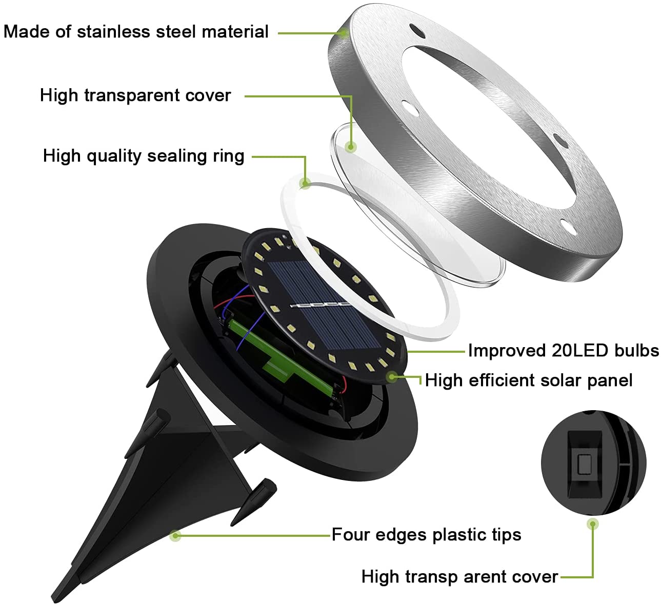 Looking for outdoor lighting that is both stylish and functional? Look no further than our 8Pack Solar Ground Lights Outdoor! These 20LED solar lights are perfect for illuminating your garden, lawn, or pathway, all while adding a touch of art deco style to your outdoor space. With a waterproof and underground sensing design, these lights are built to withstand the elements and provide reliable illumination year-round. Plus, with a 2-year warranty and certifications from CCC, CE, and ROHS, you can trust in the quality and safety of these lights. Powered by Ni-MH batteries and a solar cell, these lights are both energy-efficient and easy to install. Simply charge for 6-8 hours and enjoy up to 8 hours of bright, reliable light. Don't settle for boring outdoor lighting - upgrade to our 8Pack Solar Ground Lights Outdoor today!