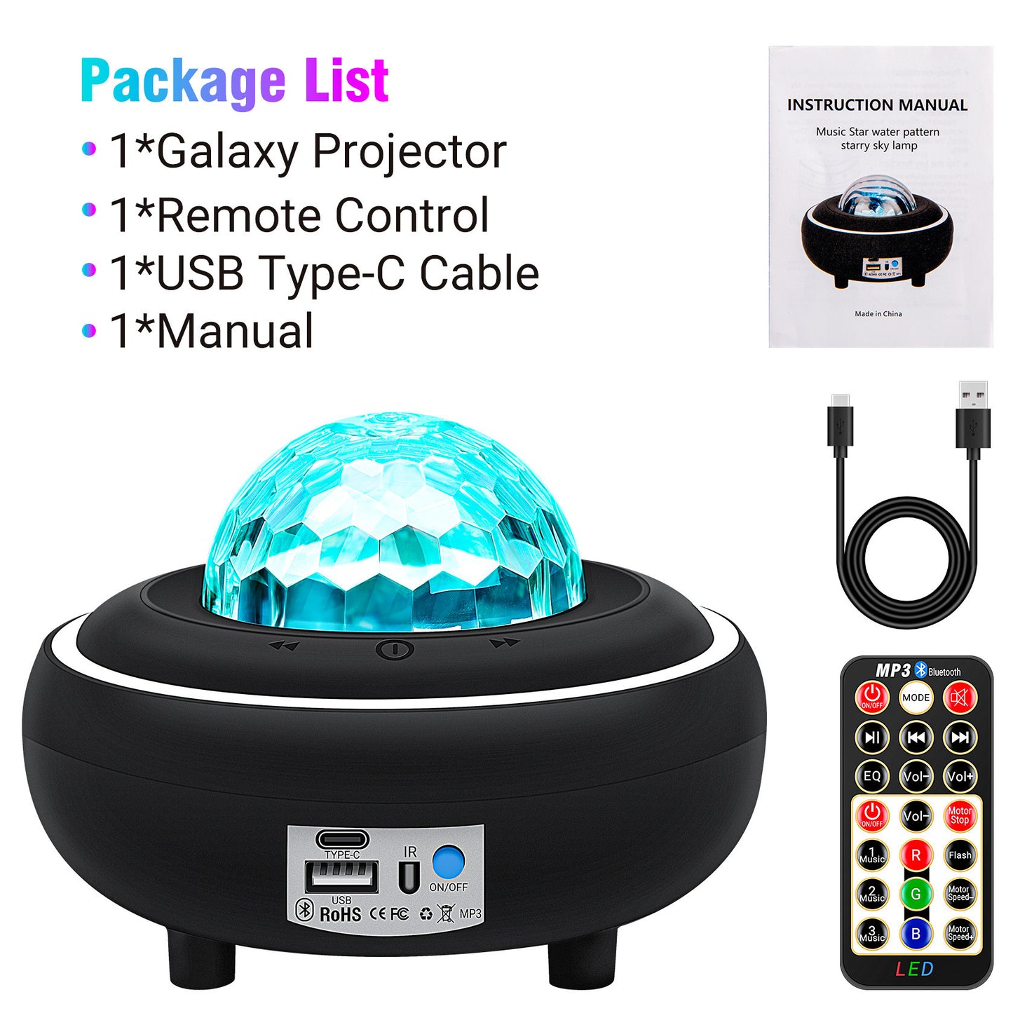 The packing list includes the lamp body, remote control, USB Android data cable (1.5 meters), and an instruction manual in multiple languages. This ensures that you have everything you need to set up and enjoy your Water Ripple Nebula Starry Sky Projection Lamp right out of the box.